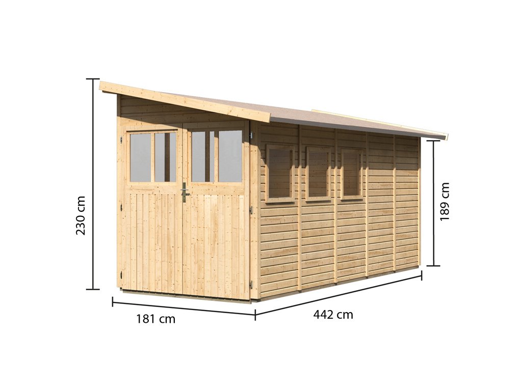 Dřevěný domek ke zdi. V domku můžete uskladnit zahradní techniku, nářadí nebo si v něm vybudovat kutilskou dílnu. Domek má šikmou střechu a jedny dvoukřídlé dveře na pantech s oknem v každém křídle. Stavebním materiálem domku jsou dřevěné profily síly 19 mm perfektně vyfrézované ze severského smrku. Dodáváme jako stavebnici v rozloženém stavu, kde stěny tvoří jednotlivé dřevěné profily, které pouze sesadíte k sobě a sešroubujete, střechu tvoří celistvá deska. To garantuje extrémně jednoduchou montáž, kterou zvládne každý český kutil.