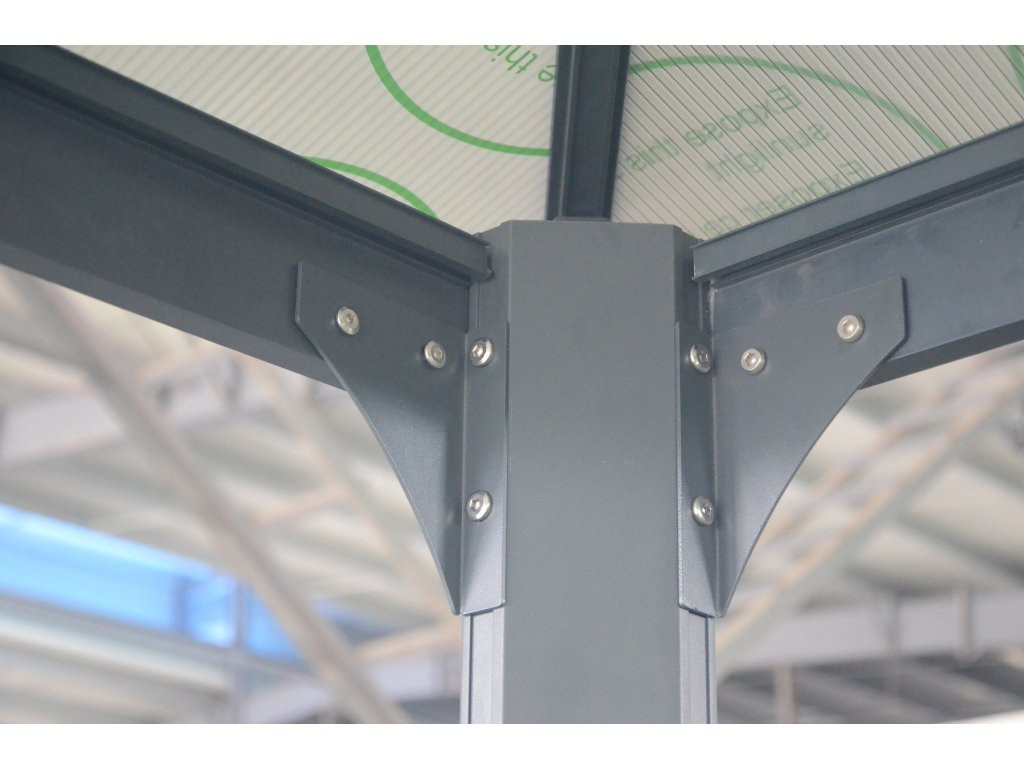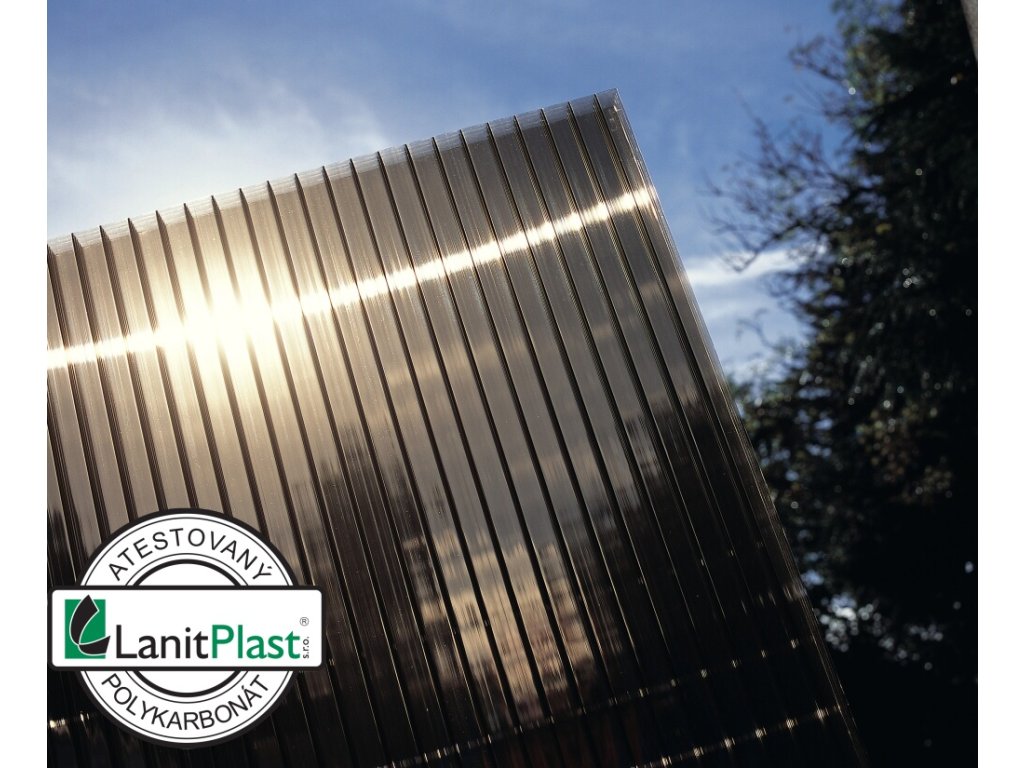 Zahradní hliníkový altán LANITPLAST 33 poskytuje potřebný stín pro posezení na zahradě. Nejedná se o běžný lehký altán s trubkovou skládací konstrukcí (jako je běžně ke koupi v hobbymarketech), ale o masivní výrobek zhotovený ze silných vzájemně sešroubovaných hliníkových profilů (síla 1,0 mm) určený k pevné montáži k zemi pomocí patek. Hliníkové profily jsou ochráněny práškovou vypalovací barvou v tmavě šedém odstínu - antracit. Spojky jednotlivých profilů jsou vyrobené z lakovaného pozinkovaného ocelového plechu 1,5 mm. Z důvodu zajištění maximální kvality je výhradně použit kvalitní polykarbonát MARLON (výrobce Brett Martin Velká Británie), který v ČR prošel náročnými testy ve státem akreditovaných zkušebnách jako stavební materiál. Smluvní prodloužená záruka 10 let na nerozbitnost polykarbonátu krupobitím je u produktů od LANIT PLASTU samozřejmostí. Střecha tohoto modelu altánu je vyrobena z bronzového komůrkového polykarbonátu 6 mm.