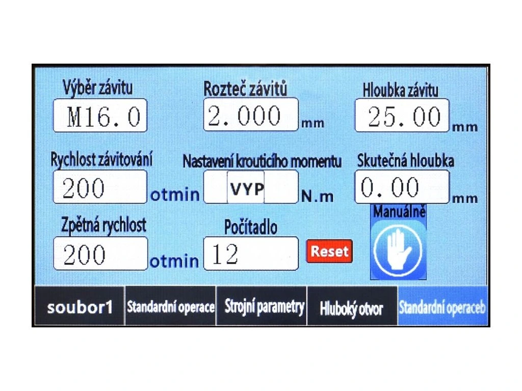 - Nastavení velikosti závitu, otáček, stoupání, hloubky řezu pomocí dotykového displeje